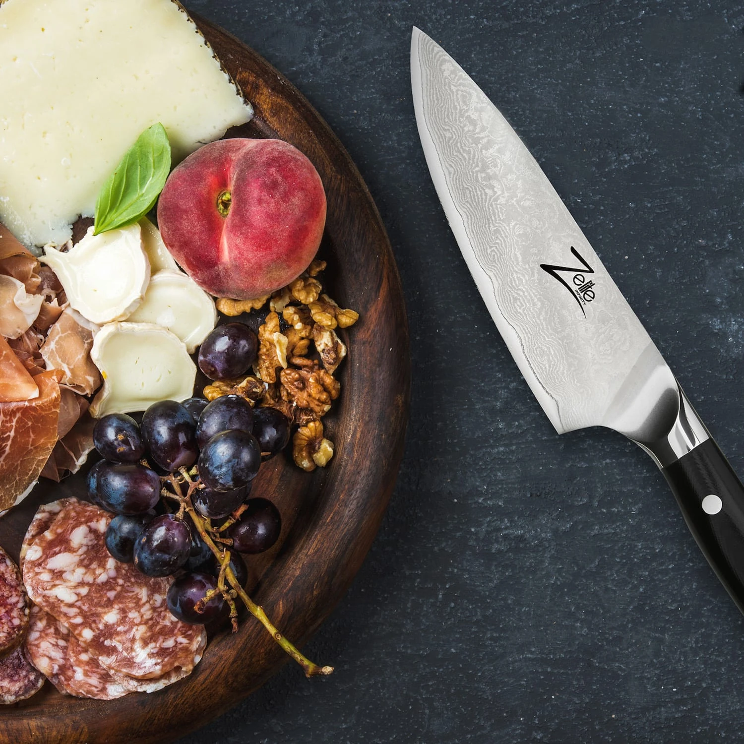 Exklusive Präzisionsmesser nach japanischem Vorbild: Die handgeschliffene Zelite Infinity by Klarstein Alpha-Royal Japanese Messerserie erfüllt hohe Ansprüche bei jeder Kochkunst. Insgesamt 67 Schichten bilden als hochwertiger, japanischer Damaszener-Stahl übereinanderliegend die changierende Klinge. Durch eine perfekt ausbalancierte und ergonomische Formgebung und einen nahtlosen, dreifach vernieteten Griff aus G10-Glasfaser liegen die eleganten Küchenwerkzeuge wunderbar in der Hand. Hier verbinden sich Schärfe, Haltbarkeit, Gewicht, Kontrolle und Handhabung mit außergewöhnlichem Design, perfektioniert durch eine kunstvolle 3-Metall-Mosaikniete im Griff.