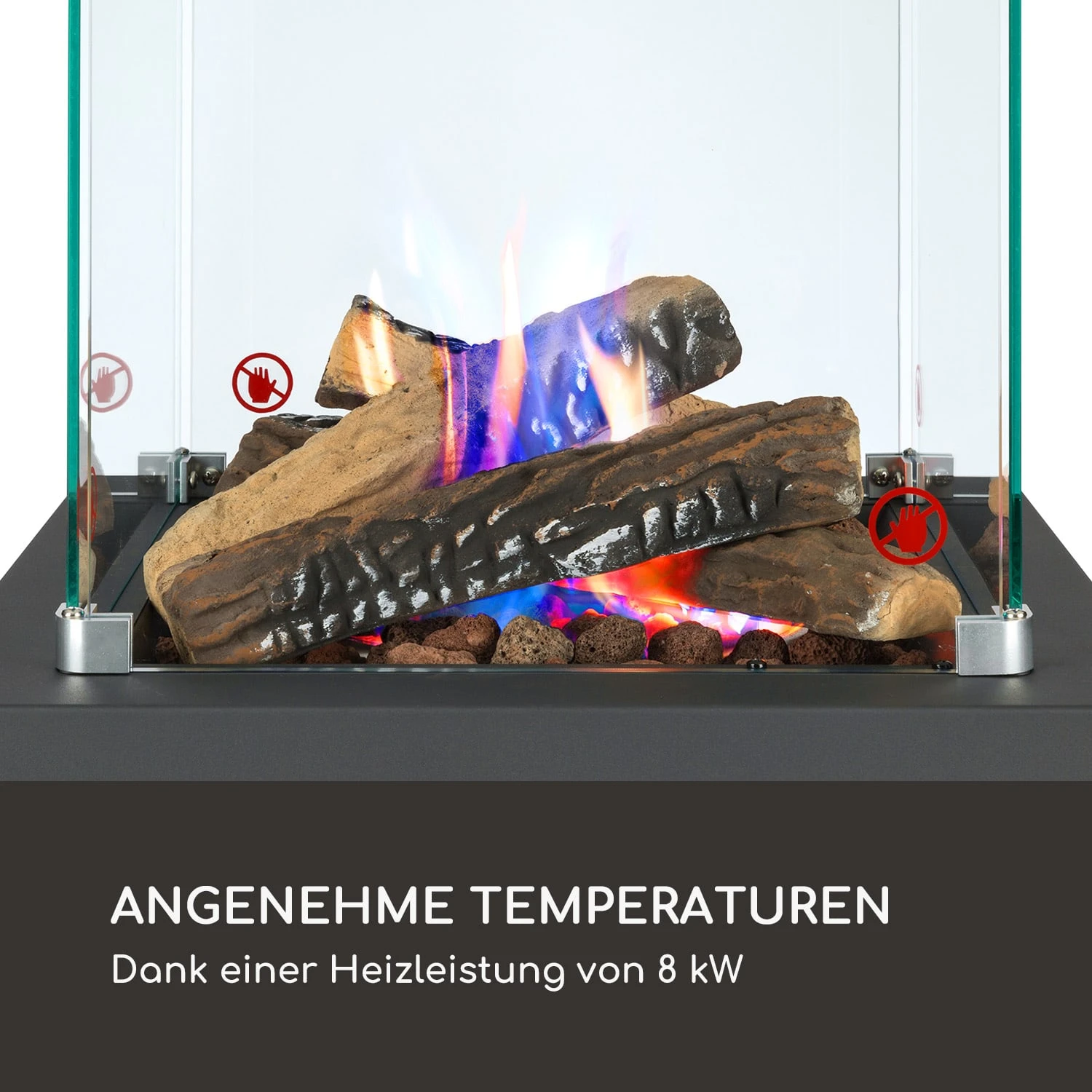 Leistungsstark und energieeffizient: Der blumfeldt Flagranti Crystal View Gasheizstrahler ist zur Verwendung mit Propan- oder Butangefüllten Flüssiggasflaschen mit bis zu 13 kg geeignet, die ganz einfach im geräumigen Innenraum Platz finden. Entfacht wird das Gerät unkompliziert über das integrierte elektrische Zündsystem. Mit einem mehrstufigen Regler sowie einem mitgelieferten Schlauch mit Druckminderer wird die Zufuhr des Gases reguliert. Die Gasheizung erzeugt bis zu 8 kW Heizleistung und versorgt den Aufstellort sowie die Personen im näheren Umkreis schnell und effektiv mit angenehm wohliger Wärme. Im Mittelpunkt steht natürlich die fulminante Flamme, die du durch 4 große Sichtfenster aus gehärtetem Glas sehen kannst. Umrandet wird die Gasflamme von einer ansehnlichen Lavastein- und Holzdekoration, die für ein beeindruckendes und ungefährliches Schauspiel sorgt. Vier Bodenrollen erleichtern das Versetzen des blumfeldt Flagranti Crystal View Gasheizstrahlers, während zuverlässige Feststellbremsen jederzeit den sicheren Stand der Freiluftheizung garantieren. Die korrosionsbeständige Bauweise aus Edelstahl macht das Gerät besonders langlebig und für die Aufstellung in Außenbereichen geeignet. Eine integrierte Sicherung unterbricht die Gaszufuhr zum Brenner, falls dieser zu Kippen droht. So ausgerüstet erweitert er die Freiluftsaison um ein paar weitere Monate mit behaglicher Wärme.