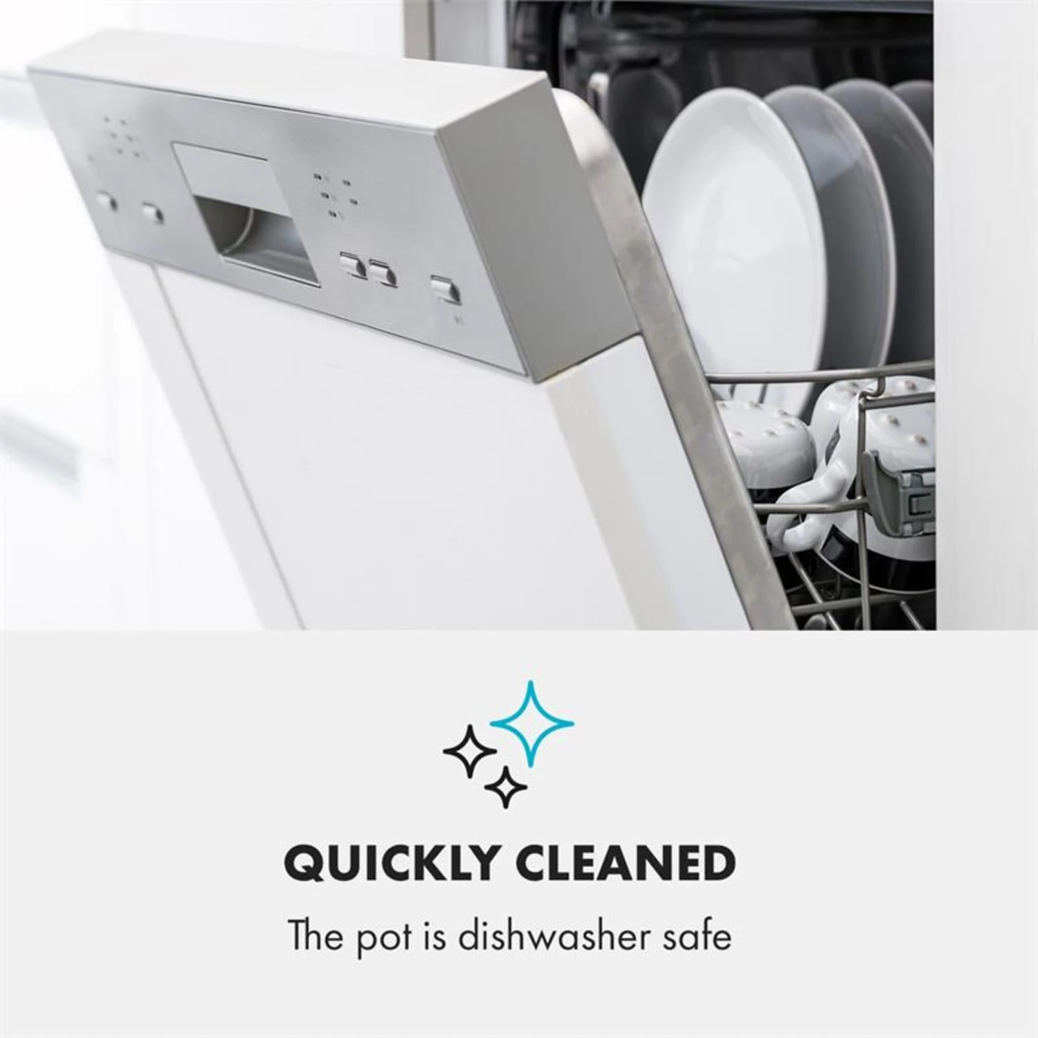 Nach dem Kochen ist der Topf des Marmeladenkochers schnell gesäubert, zumal er sich in der Spülmaschine reinigen lässt. Mit drei Litern Volumen bietet er viel Platz für jede Menge Marmeladen und Gelees.